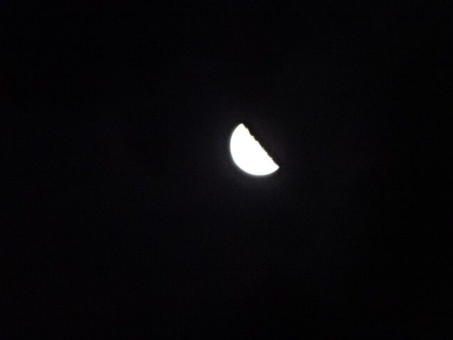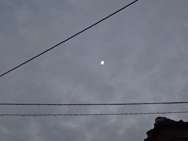 これは、今日の6時頃の月です。月齢が21.9、下弦(かげん)の月と書いてありました。半月ですね。先日、満月 その日はスーパームーンと呼ばれる大きくて強い光を放つ月が見られましたが、その日は光が強くて月のまわりがはっきりしませんでした。今日は、まわりもきれいな形の月の写真を撮ることができました。これは空を見上げたあと、視線を戻すと目にはいった光です。街灯です。これは光っている電灯が近い距離で強い光を放っているので、電灯のまわりがぼやけて明るく輝いています。これは、前の道から見た自宅の勝手口の光です。光といっても電灯をつけているので、その明かりです。しましまになっているのは、勝手口の戸が網戸にもなるので、そのときは少し不用心な感じになるためついている金属の格子(こうし)です。格子(こうし)は区切り、仕切りのことですよね。(くどい書き方ですみません)その前に斜めに写っているのは、私の車のフロントガラスが光っているところです。今日の写真はどれも真っ暗な背景です。くらい雰囲気になっていますが、私の気持ちがくらいということではなく、今日はゴミ出しの日なので家を出る前に見たいろいろな光です。月、というタイトルですが、月の写真は1枚だけで申し訳ありません。きれいな半月の写真が撮れて、うれしくなりました。