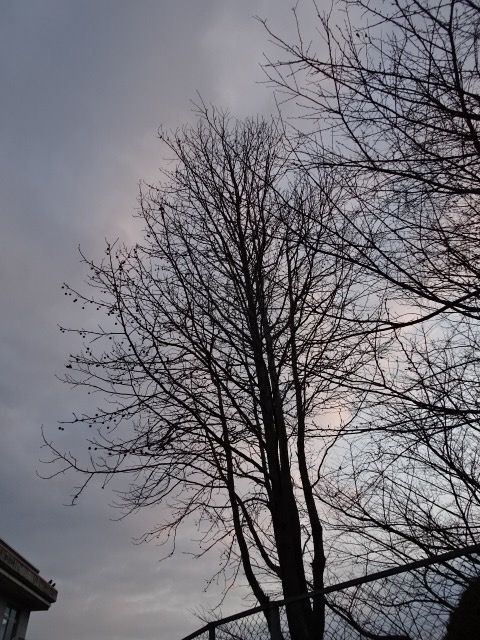 私の職場の玄関横にある木です。楓(フウ)の木のようです。葉はほとんど落ちていますが、残っている実は以前見たタイワンフウ(台湾楓)と同じものでした。昨日は空は曇り空でしたが、枝が空に映えてきれいでした。夕方撮った空です。雲がひとつ空に浮いていて、茜色に染まってきれいでした。夜は月が出て、その光で木の枝が照らされていました。ちょっと幻想的な空でした。昨日の月は月齢12、15が満月ですから、あと3日で丸くなるほとんど満月に近い月でした。昨日も寒くお昼から雪が降り出しましたが、夕焼けも見え、夜の空に月も見えました。少し雲がある空も、それなりに素敵で私は気に入っています。そんな空と木の写真が撮れて、うれしくなりました。