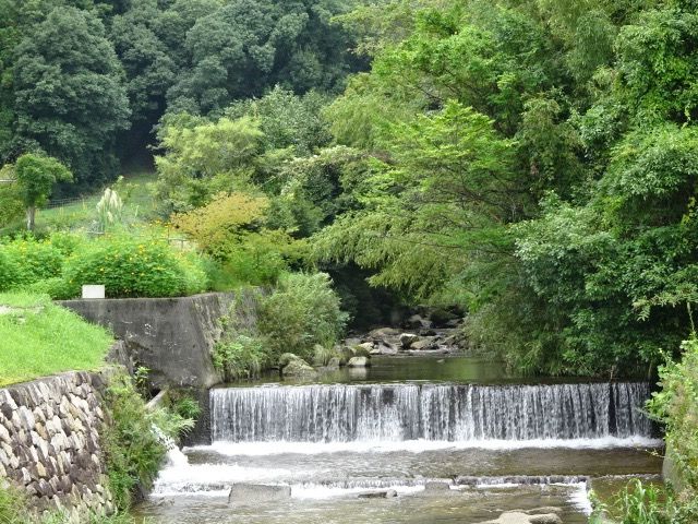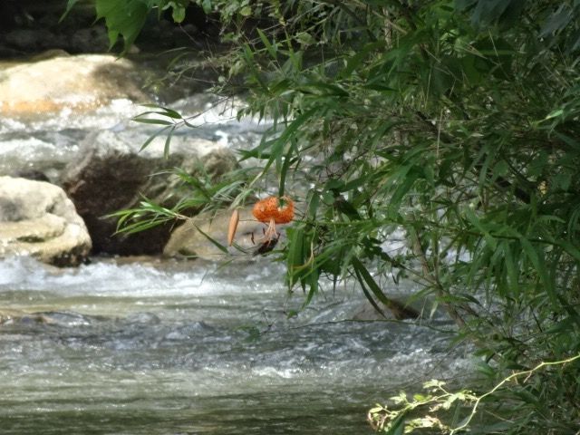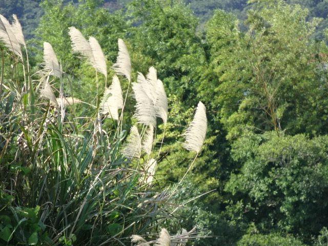 渓流のそばを通りました。流れの横に、黄色い花とススキが見えました。花の横の道は、竹林のほうへ続いていました。渓流の流れる音を聞きながら、奥へ続く道を眺めていました。