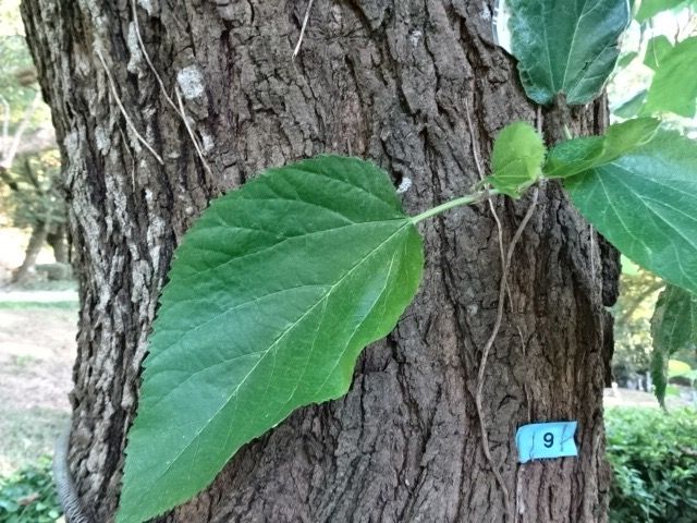 クワの木を見かけました。大きな葉がたくさん茂っていました。木はこんな形でした。5メートルくらいの高さでした。振り返ると駐車場のすみにネコがいました。安心して寝そべっていたのにと、少しムッとしたようにこちらを見ていました。クワの葉は、絹糸をとるカイコが食べるとは聞いていました。こんなに大きな葉であることや、木がこんなに高いことは知りませんでした。びっくりしながら振り返ると ネコを驚かせてしまいました。天気の良い夕方の出来事でした。