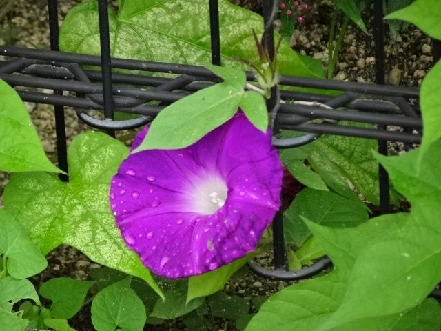 アサガオが咲いていました。フェンスに、つるを絡めていました。フェンスの下に、花が並んで咲いていました。紫やピンクが鮮やかでした。