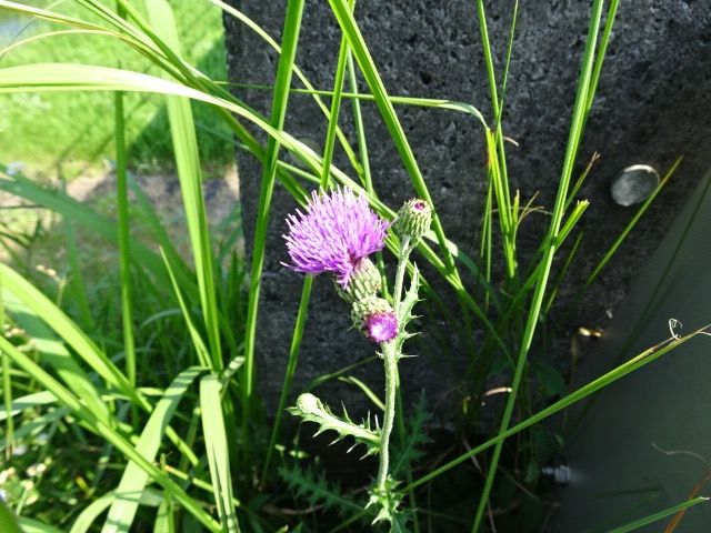 川岸でアザミが咲いていました。まだ開いていない花もありました。白い花も咲いていました。ヘクソカズラという名前だそうです。夏草が勢いよく茂る中で遠慮がちに咲く花が、可愛らしく見えました。