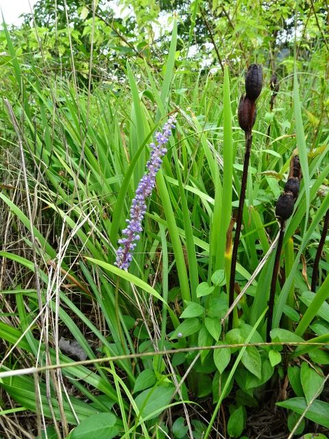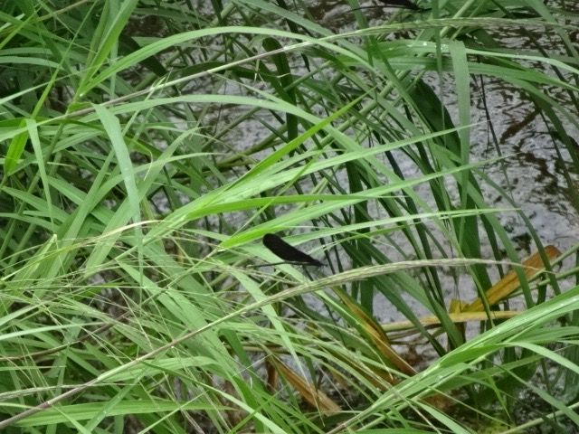 小川の中の草に、ハグロトンボがとまっていました。写真の中央に、黒い羽を閉じてとまっています。トンボの横では、小川が涼しげな音を立てて流れていました。流れは、ずっと向こうまで続いていました。赤とんぼはよく見かけますが、ハグロトンボはあまり見たことがありませんでした。珍しくて、しばらくじっと眺めていました。