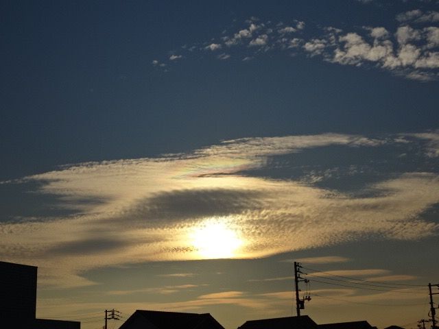 西の空に夕日が見えました。夕日の上には、うすい雲が広がっていました。雲の先は東の空へ続いていました。夕日と雲がきれいな夕方でした。