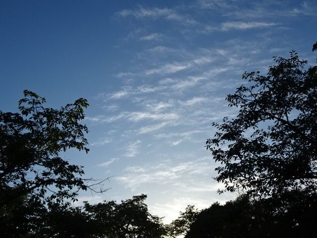 山の中腹にある広場から見た空です。夕方の時間でした。薄く広がっている雲が、さざ波のように見えました。夕日から離れるにつれ、空の青色が濃くなっていました。木の向こうに見える空の模様を、しばらくの間 眺めていました。