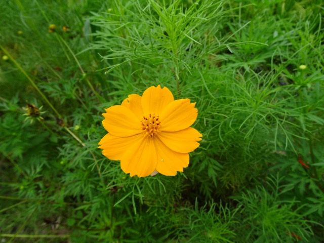 キバナコスモスが咲いていました。優しいオレンジ色の花でした。花の向こうは田んぼでした。イネに穂が出ていて、秋の雰囲気を感じる風景が広がっていました。