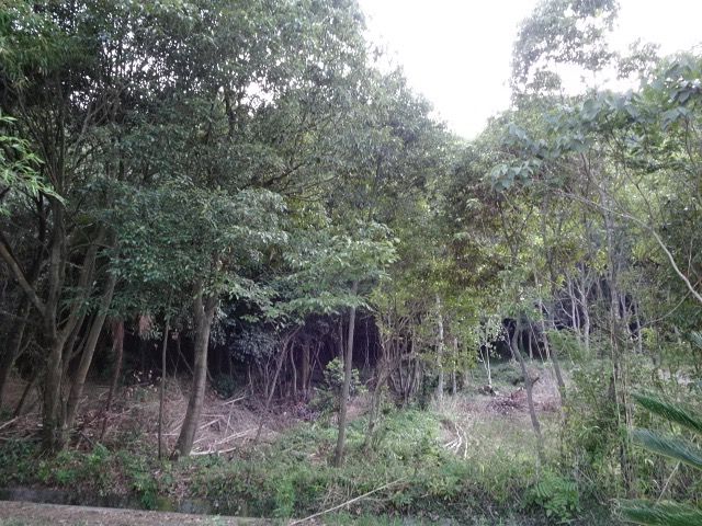道路沿いの、木陰ができる場所に立ち寄りました。木の向こう側は、竹林と山が見えました。山の右側にも竹林がありました。手前は田んぼで、一面の緑でした。いろいろな色合いの緑が鮮やかな風景でした。