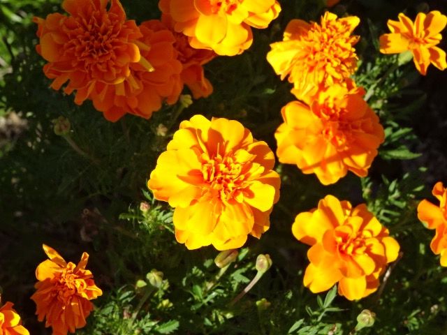 マリーゴールドが咲いていました。たくさんの花が咲いていました。横のフェンスに、ミニトマトがなっていました。オレンジや赤がきれいな花壇でした。