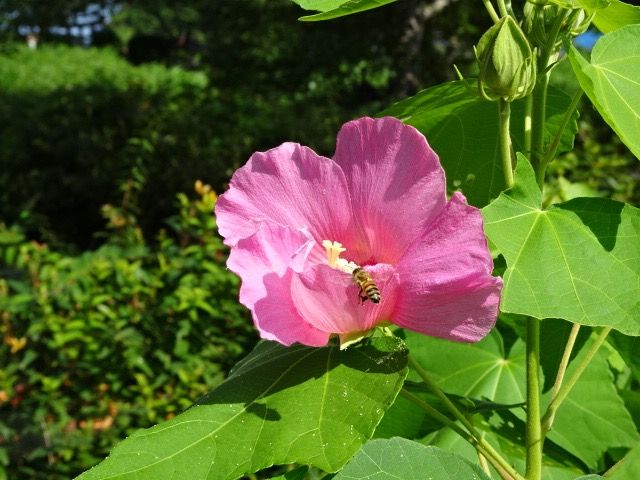 ピンク色の花が咲いていました。フヨウのようです。花の横には、つぼみがありました。花の向こう側は、木が緑の葉を茂らせていました。花の近くの木は サクラです。緑の中で、ピンクの花が可愛らしく咲いていました。