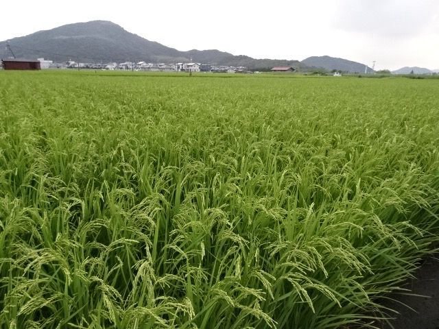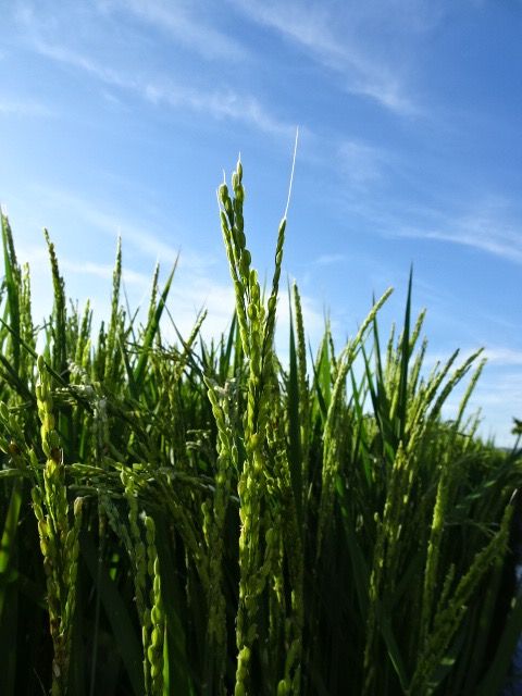 イネに穂が出てきました。田んぼは、ずっと向こうまで広がっていました。弧を描いている穂もありました。夕方の時間で、日が西の空にありました。イネが風を受けて、さわさわとゆれていました。