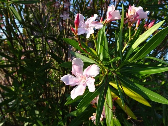 キョウチクトウの花が咲いていました。たくさん咲いていて、ピンクの花束のように見えました。天気の良い夕方でした。夕日がキョウチクトウを照らして、その横を人や車が通っていきました。