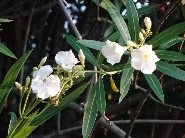 キョウチクトウの花が咲いていました。白い花でした。木全体に花が咲いていました。空を見ると、夕日とその上に広がる雲が見えました。キョウチクトウの花は、ほんのりと夕焼け色になっていました。
