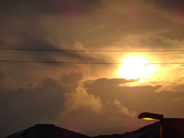 夕日が見えました。曇りがちの日で、雲が夕日を囲むように広がっていました。少し離れた場所で、もう一度夕日を見ました。夕日だけを見ると強い光を放っていましたが、まわりの空まで見ると だいぶ印象の違う光でした。少しずつ暮れていく夕方の風景が広がっていました。