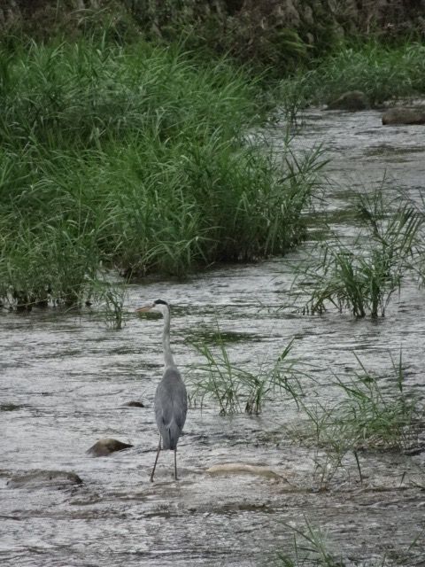 サギを見かけました。小川の浅瀬で、きょろきょろしていました。エサの魚を探していたのでしょうか。サギのまわりはこんな風景でした。小川の流れる音が響き、流れの真ん中でサギが辺りを見まわしていました。