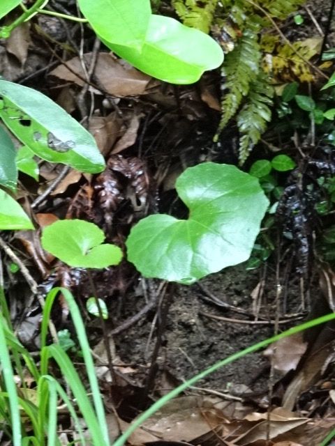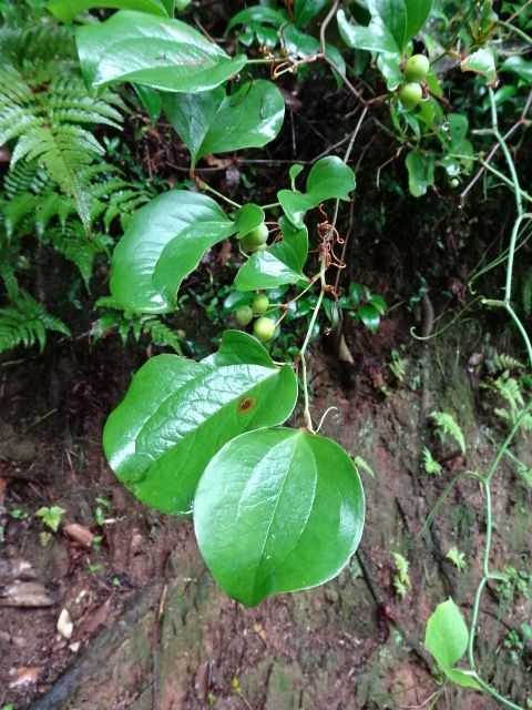 まるい葉を 見かけました。サルトリイバラのようです。実がついていました。葉のまわりでは、シダが茂っていました。山肌の土が、雨でしっとりしていました。