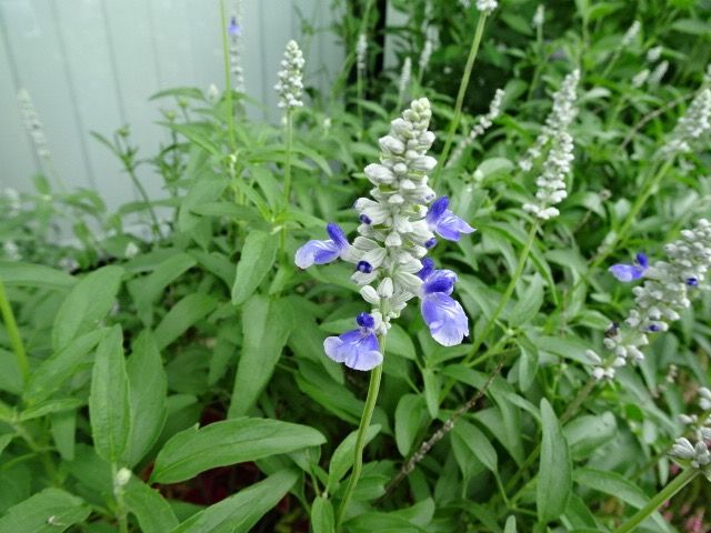 お店の花壇で見た花です。小さな花が 縦に並んでいました。とんがり帽子のように見えました。紫色が 落ち着いた雰囲気でした。
