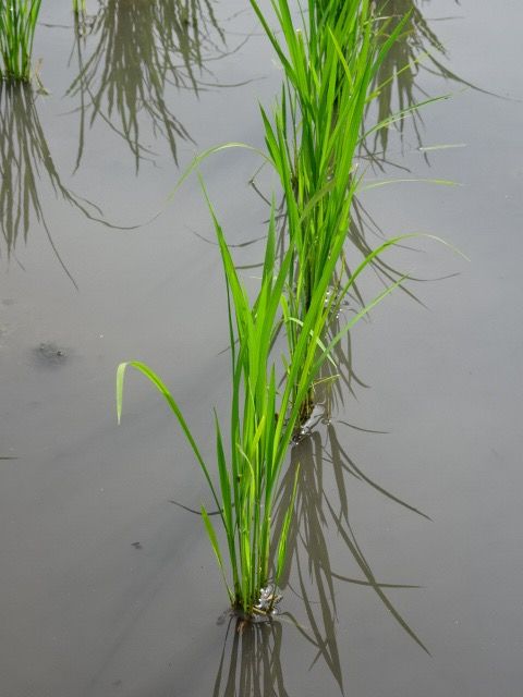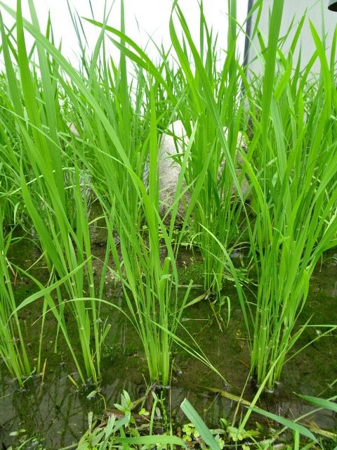 イネがまっすぐ 伸びていました。上から写しました。根元に水草が 浮いていました。まるい形の葉っぱでした。