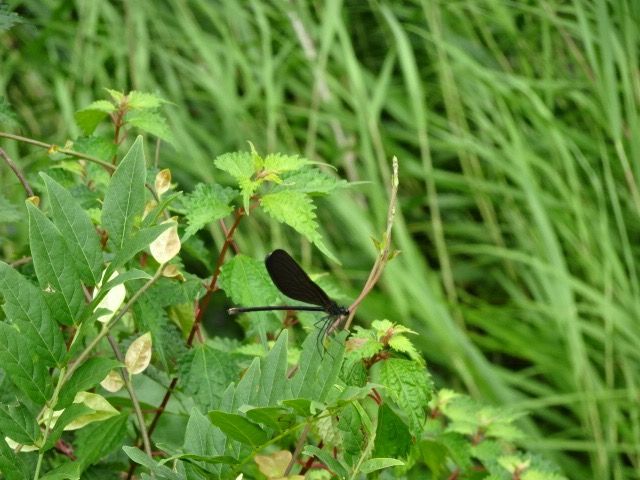 ハグロトンボを 見かけました。飛び立ちました。今度は、羽を開いて とまりました。別の葉に とまりました。羽をひらひらさせて飛ぶ とんぼでした。