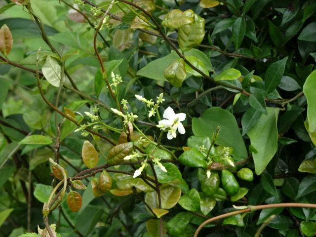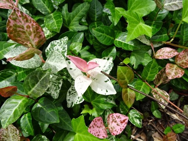 小さな葉を 見かけました。まっすぐ伸びた葉も ありました。葉は、道沿いの林で広がっていました。ツタの葉が、間から顔を出していました。