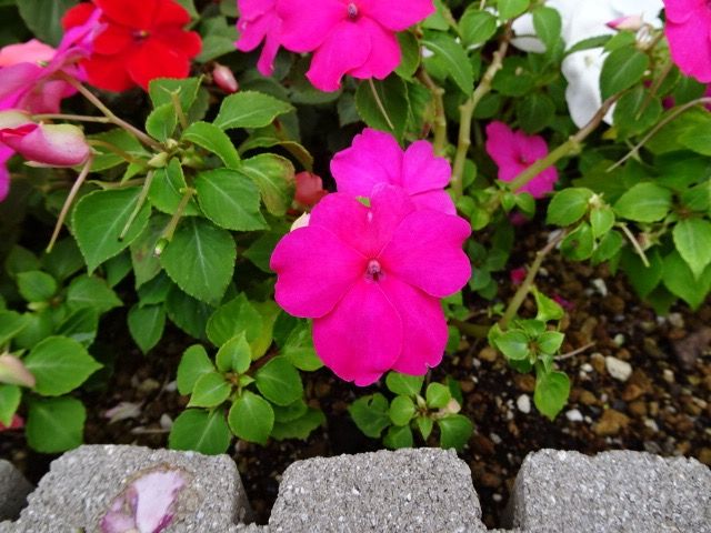 インパチェンスの花が、咲いていました。赤い花も咲いていました。色とりどりの花が、咲いていました。カラフルな花壇でした。