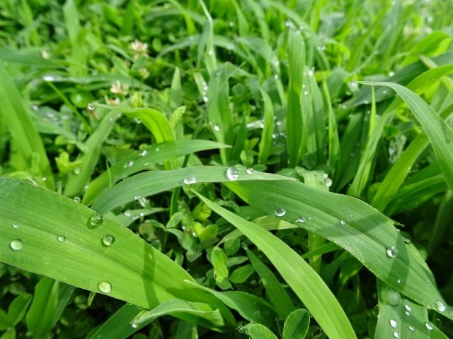 葉の上に 朝露がのっていました。朝日を受けて、光っていました。葉に近づいて 写しました。しずくの向こうで、シロツメクサの花が咲いていました。