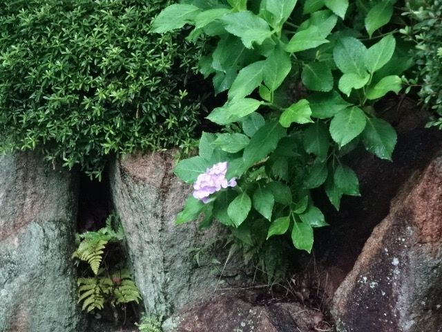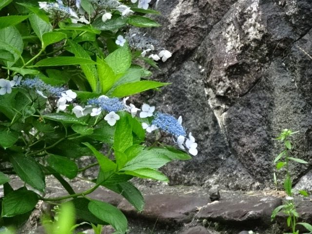 アジサイを見かけました。葉が 雨にぬれていました。岩の間から、葉が勢いよく伸びていました。小雨の降る日でした。