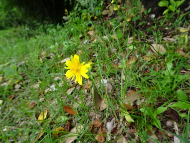 黄色い花が 咲いていました。細い花びらでした。草むらで 咲いていました。葉は別の植物の葉でしたが、この花の葉のように見えました。