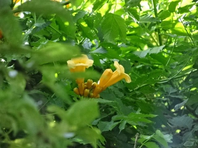 ノウゼンカズラの花が、咲いていました。花の房が、ふたつ並んでいました。花の上では、木の枝が広がっていました。陽射しがまぶしい日でした。