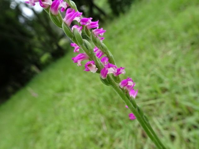 ピンクの花が 咲いていました。ネジバナのようです。花が 茎のまわりをくるりとまわりながら、つながっていました。まっすぐ 上に伸びていました。ピンク色が可愛い花でした。
