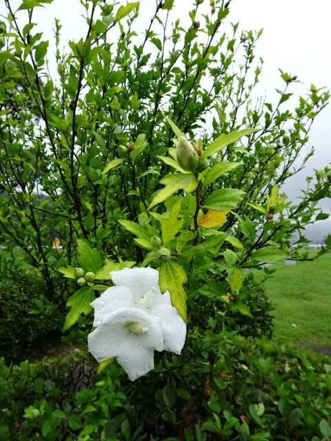 ムクゲが 咲いていました。雨のしずくで、花がお辞儀していました。つぼみにも 雨のしずくが ついていました。弱い雨が降る日でした。