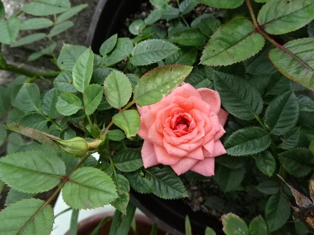 バラが 咲いていました。ピンク色の花でした。赤いつぼみも ありました。開いたところを思い浮かべて、しばらく眺めました。
