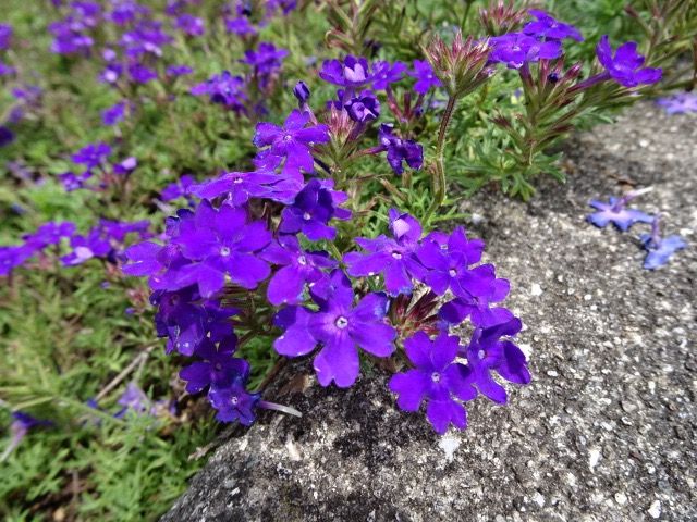 シバザクラが 咲いていました。濃い紫色でした。たくさん 咲いていました。よく晴れた日で、夏のような陽射しでした。
