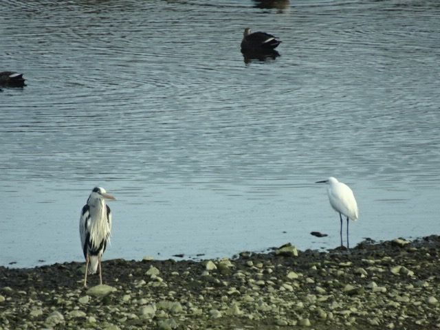 昨日は川の中央部は水がなく、そこにサギがいました。