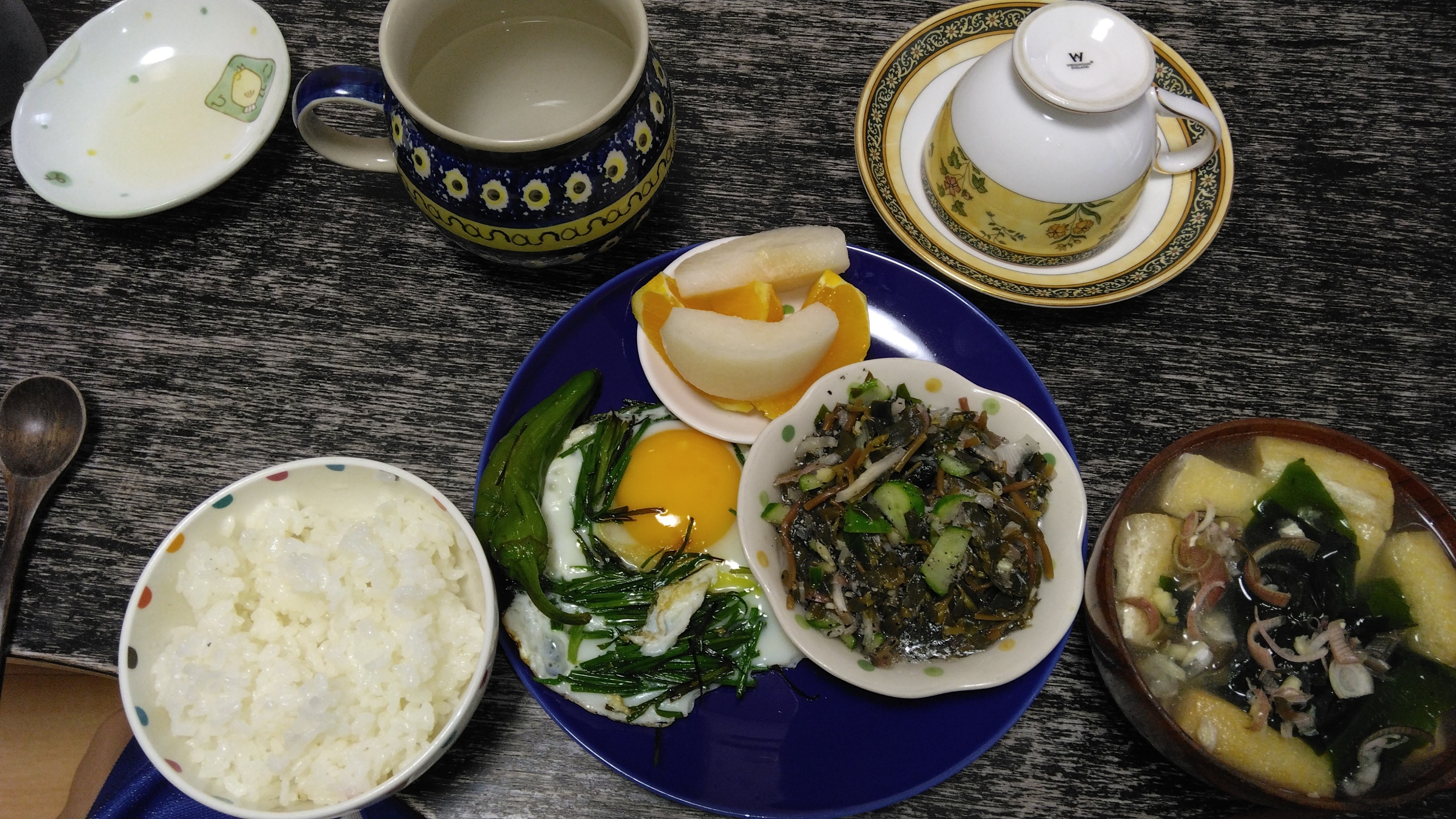 朝ごはんは、お家で目玉焼き丼と具沢山みそ汁、野菜とフルーツいっぱい。飲み物にコーヒー、白湯にきな粉を溶かしたのが定番。焼き海苔と大葉(夏~秋)でご飯を巻き巻きして食べるのが、うまい!