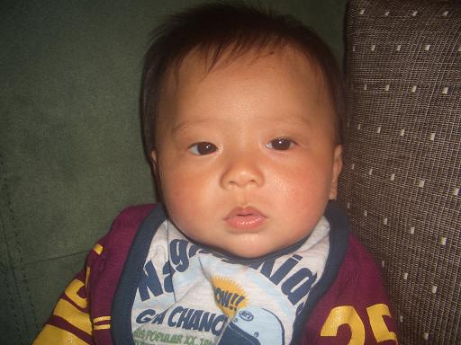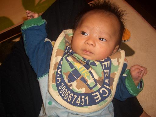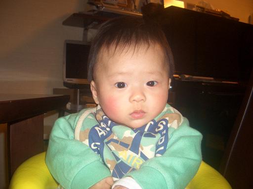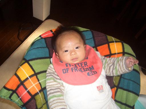 旭、3ヶ月になりました早々と首も据わり、抱っこも楽チンですあやせば笑い、話しかければナンゴで返答。うつ伏せにすれば、首を上げるのではなく、何故かハイハイもどきでバタバタ。縦に抱くと、自分の足でシッカリ立とうと頑張っています。迅も足の力は強かったけれど、彼以上かも目標、9ヶ月で歩行 成長もなんだ問題も心配もないのですが、唯一気になるのは乳児湿疹。3ヶ月検診まで待とうと思っていたのですが、胃腸炎の時についでに診察して薬を出してもらうと…… その薬が合わなかったようで、顔中ただれ 結局、検診前に別の病院へ行く事に。開口一番、『ヒドイなぁ…』やっぱり、酷いんですね 本人も痒いのか掻き毟るし非ステロイドの軟膏と抗生剤を出してもらいました。これでチョットはマシになるかなぁ… 早くキレイな顔になればいいね
