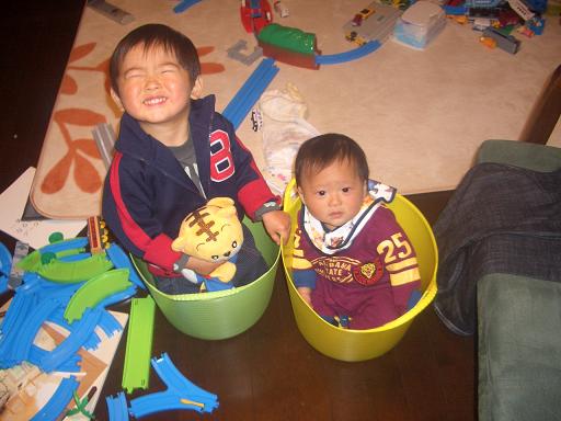 迅、2歳4ヶ月になりました。お兄ちゃんになって2ヶ月。甲斐甲斐しく旭のお世話をしてくれるのですが…… ホトンド空周りまぁ2歳に完璧を求める方が間違ってるんですが役に立つのは、オムツ換え。 お尻拭きとオムツをセットで持ってきてくれ、さらにオムツを出したら片づけまでやってくれます。 これは助かる 一度、『パパより賢いね』と褒めたら、片づけする度に『パパより賢い?』と嬉しそうに聞いてきて…… 余程 嬉しかったのかなぁ 褒めて育てるってこの事だと悟りました出産前には(チャントお兄ちゃんになれるんだろうか…)と心配していたのですが、そんな心配をよそに 「お兄ちゃんが○○してあげたからねぇ~」と自分が兄である事を自覚している様です 良かった身体的な成長は、なかなか増えなかった体重も ようやく服を着た状態で11キロ達成。身長は……測っていないので判りません食欲も出てきて、イッパイおやつを食べた後でもご飯が食べれる様になりました。ただ、好き嫌いは以前と変わらずですが言葉は大人並。 話し方は私ソックリハッチには『自分を見てるみたいやろ?』と言われるほど。 どこでそんな言葉を覚えたの?と聞きたくなる様な事を口にする事もあり…ビックリしたりハラハラしたり 最近はお買い物ゴッコが好きなのか、『こっちの方が安いですよ~』『五百円になります(何故か百円、五百円、五千円の3パターン。)』『ママ、何がいい? アイスコーヒーか? お茶か?』と。 外で大きな声で言われると、恥ずかしい事も多々 成長過程…なんでしょうけどね迅を単独で見ると、まだまだ赤ちゃんに毛が生えたレベルですが、旭と比らべると確実に成長していて、2年の差ってスゴイなぁと。 早く成長して欲しい…と思いながら、男の子だけに 早く成長されて離れられるのもなぁ…とチョット微妙な心境。 ウザイ…と思う事もあるけれど、まだ『ママぁ~』とベッタリされる事が嬉しかったり 私って勝手 イッパイ怒ったり手を上げたりするけれど、でも、キホンは大好きなのよ…迅サマ