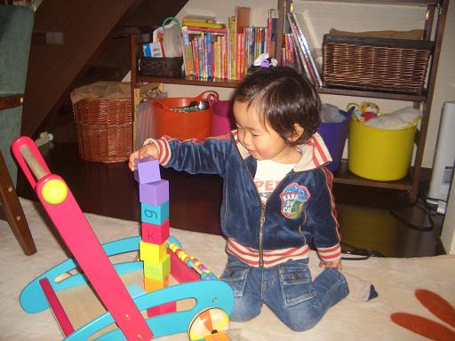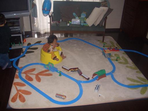 『ママぁ~ 電車で遊ぼうよぉ~』 要するに、線路を作れという事です結構、頭使って作らなきゃいけないから 面倒なのに……と思いながらも、作り出すと意地が出て 迅が触ろうとするのを『触るな』とマジ怒りして作った線路。 『ママぁ~ 電車走らせてイイぃ~?』どうぞどうぞ、お気の済むまで… 電車と同じ目線で遊んでいます。作った人、ママ。遊ぶ人、迅。そして…… 傍観者、旭。