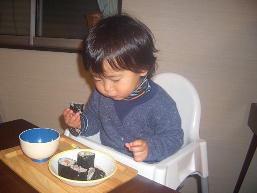 節分なので… 恵方巻きを作りましたハッチが普通の太巻きが嫌いなので、我家では毎年 韓国風海苔巻きとサラダ巻き。美味しいからいいのですが、普通のも食べたいなぁ……迅は好き嫌いが多いので、チャント食べてくれるように 大好きなウインナー巻きウインナーとキュウリを合わせて巻いてみましたが、『キュウリ、食べないもんね』と見事にキュウリだけ引き抜かれ でも、海苔好きの彼には 巻き寿司は好評でした『恵方向いて、お願い事をしながら 黙って食べるのよ』と教えると、おとなし~く食べていました食べ終わった後に、『何をお願いしたの?』と聞くと、『え~っとねぇ… 内緒。』だそう。 首をかしげながら、笑っていたので コレは理解してないな…ママは、皆が健康に過ごせるように・迅がちゃんとママの言う事を聞くように…とお願いしましたよ ちなみに旭は……爆睡