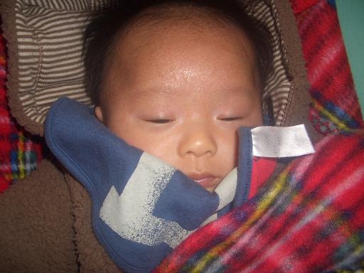 旭、飲んで寝、泣いたら寝かしつけられ、起きればまた飲まされ…その繰り返しで1日終了。お陰で、すくすく成長べビザラスで体重を測ってみたら、6240グラムになっていました先週、計ったら5860グラムだったのに… 夜も、1回の授乳で4~5時間、長い時には7時間ほど寝てくれます。寝すぎか??その為、見事な絶壁にキレイな頭の形で生まれてきたのに…シマッタ シマッタ ヤッテシマッタ