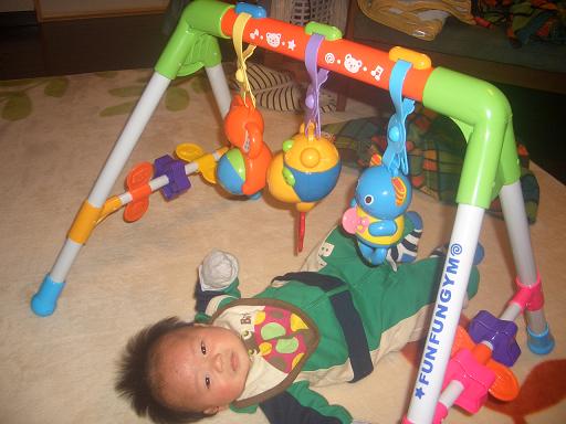 1人目の時は、玩具やお世話グッズも張り切って買っていましたが 2人目となるとお下がりばかり。肌着も、洋服も、玩具も……… チョット可哀相な気が そんな時、ハッチのお義母さんからタイミングよくトイギフト券を頂き…それで旭に玩具を購入 旭専用最近、自分の手やメリーに興味深々の彼。だから、この玩具を買ってあげたかったんですしかし、『迅も、迅も』と言って、旭から玩具を取上げ、寝転がって遊んでいました兄さん…それ、赤ちゃんのですぜいつもは、ただ床に寝かされ放置されるだけの可哀相な旭。玩具を置くと、嬉しそうに(?)玩具を見つめ、手で叩いていました旭クン、今日からはママに放置されても 玩具が相手してくれるよ~