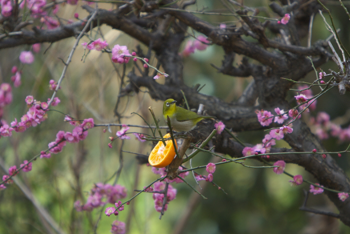 今年に入ってから、大手カメラメーカーでは新型一眼レフラッシュに沸いてますね~ソニー、オリンパス、ペンタックスがそれぞれ2機ずつモデルチェンジしました。新型はどれも予想の範囲を大きく超えるものではないものの、着実な進化と高性能化を進めています。ニコン、キャノンはエントリー機を1機ずつ追加したのみ・・・。現段階では話題性が少なく、ちょっと寂しい気もするのですが、天下の二強が黙ってるワケないじゃろ~なんて思ってます。きっとこの二強は中級機&上級機でガチンコ勝負してくるんじゃないかな~それぞれエントリー機をちょっと出してみて・・・市場の様子を窺がって・・・。勝負のタイミングを計っているんでしょうかね。ゴールデンウィーク前後や夏のボーナス商戦、北京オリンピック直前や秋の新製品発表など、新型を投入するタイミングはいくつもありますので、業界ニュースが楽しみです♪いつものメジロ。今までの写真と比べてみて・・・やっぱり花っていいなあ~。あるのと無いのとでは華やかさが大違い。