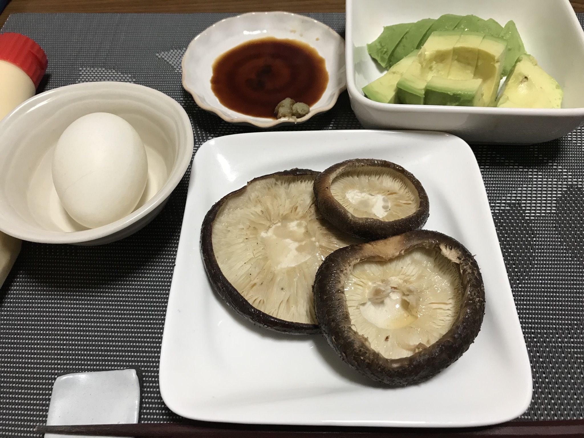 しいたけステーキと、アボカドわさび醤油、ゆで卵にしました。