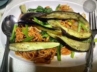 というわけで、今日のお昼は万願寺とうがらしではなく、ナス入りナポリタンにしました。