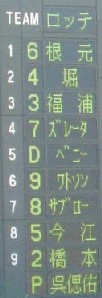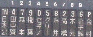 今季初スカイ。オープン戦初観戦。Bs-F戦⇒ニッカンスコア。とにかく暑かった・・・ 練習時の坪井。 魅惑のツーショット。 スタメン。ハムのスタメンメドレーから木元が抜けていたのはご愛嬌?!(爆) 試合後半にブルペンに来た中嶋。 最終メンバー。オリはスタメンの見る影なし。結果は3-3の痛み分け。Bs応援団、何か今日は多かった。闇トレ(?)したのか、新入団選手への演奏も完璧に近かった。由田に新応援歌!と思ったら、今はなき五島のやつ。後ろに少年野球が座ってうるさい。・坪井のファンファーレに 「あ、これ阪神が濱中にやってるやつや」・選手登場曲に 「阪神は選手が好きな曲選べるねんで」 「オリックスは真似ばっかりやなぁ。ジェット風船もや」強ち、全て間違いであるとは言い切れないが、視点が、全て阪神発祥だと思って止まないところにある。 帰宅したら父親に、「ようさんお客さん入っとったか?」私「うん、わりと」父親「そうか、2万くらいか」私「う~ん、どうやろ・・・」公式戦でもそないに入りませんが、なにか? 本当に暑くて、めちゃめちゃ焼けました