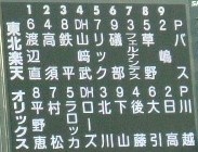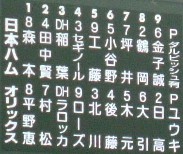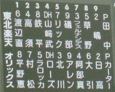 実に7月1日のBs-F戦以来の生観戦。で、6月初めのBs-B戦以来のスカスタ観戦。Bs-F戦@スカスタ ⇒ニッカンスコアガッツリ書こうとして、画像処理から~って思ったけど、デジカメ-PCのケーブルが見当たらん。っていうか、明らかにさっき手にとったはずなのに見当たらん。また、明日書きます・・・。あ、明日夏休み取っちゃった【以下追記】仕事を定時で終え、ちょうど休みをとっていた次姉と総合運動公園駅で待ち合わせ。人が多いからという理由をつけて3塁側へ。「ゆっくり見たいし」と言い訳をして巧みにブルペン付近へ。 スタメン。Bsがちょっと青っぽい。最初はあまり思わなかったけど、両チームともDHがイメージと違っていた。 先発・ダル。試合は、なんとなく貧打なような。そして、エラー多し。 うた。最初分かんなかった。「51って誰やろ。最近若い人多いしなぁ・・・」って思ってた。 えじりとうた。 中嶋登場。エライさんなんで、御自ら開けたりしません。下々の者が開けます。 先生・中嶋 生徒・武田久武田久の応援会が団体さん紹介でビジョンに出てて、ブルペン捕手の方に「おい」って感じでつつかれてました。武田久って、小柄な丸まっちい幼児体型、、、カビーに似てませんか?(爆) サヨナラ。一番に日高に襲い掛かっていたのは北川。ヒーローインタビューでは、ずっと「大引選手が・・・」と繰り返していた日高。何か弱みでも? スコア。普通、サヨナラの×印って、9裏得点の横に出るような気がする。各種番組>>>>>野球中継>ニュースくらいな次姉と観戦。そこそこ解説しつつ。(木元は6月末頃までオリックスやってんで、とか)そんな次姉からのびっくりした質問。「なんで天体観測なん?」知るか。