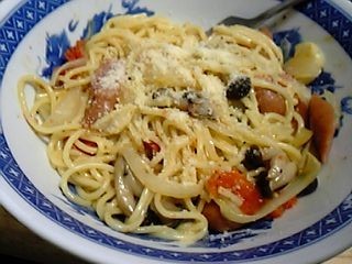 ホイル焼きが!と思ってた昨日ですが、冷凍庫をチェックしたら冷凍ゴハンが切れてるのに気づき、これからゴハン炊くのも面倒だなぁ、ってことで炊飯器でスープスパでも!ってことに変更することに。そう、スープスパのつもりでした。【レシピ】材料:パスタ100g、玉ねぎ 半分、ウインナー 3本、にんにく ひとかけ、コンソメ こさじ2杯、塩コショウ、白ワイン 50cc、水 400cc1.玉ねぎ、ウインナー、にんにくを適当に薄切りにする。2.炊飯機に、オリーブオイル、にんにく、玉ねぎ、ウインナー、しめじと適当に入れていき、パスタを半分に折ってその上に乗せる。3.白ワインと水を加え、コンソメと塩コショウを適当に振って蓋を閉める。4.炊飯機スイッチオン。5.沸騰したら、蓋を開けてパスタがくっつかないようにかき混ぜて、また蓋を閉める。適当なやわらかさまで煮たら完成。結構、水を多めに入れたつもりだったんですが、ちょっと電話がきて止めるタイミングを逃し、炊飯終了まで放置してたら、すっかり水分が飛んで普通のパスタ状態に(苦笑) 粉チーズふりかけていただきました。味は美味しかったんで問題はなかったんですが。うちで使ってるパスタはコレ。イタリアでおみやげに買ってきたら、輸入されて近所のスーパーでも売っていたという一品です!(笑)きっとそれだけ有名なんだ・・・。