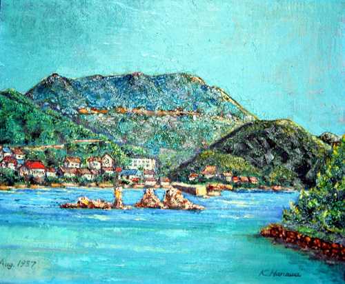 新上五島町の蛤海浜から榎津郷を見渡す油彩は、居間の壁に掛けてあります。 遠方に…