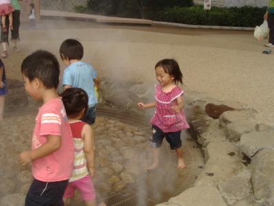 今週もあっという間でいろいろでした。月曜日お友達と公園で一日遊んでました。ここの公園は高速の下なので午前中は日陰なんです。日焼けもきにならないので、この日は1日遊んでました。霧のシャワーが下からでてきます。子供たち喜んで円の中を走り回ってます。