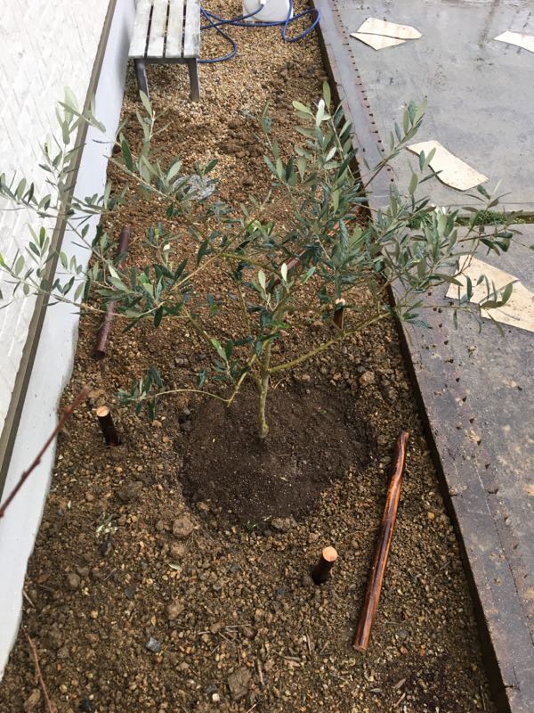 オリーブの植え替え作業をするべく万全の体制を整え (次男をおもいっきり遊ばせいつもの朝寝より1時間遅く朝寝させ長めに寝てくれるように仕向けました) 角スコを持って掘り進めましたが結構根っこ切っちゃったりして(汗) オリーブは浅くしか根付かないのが幸か不幸か ぐいっとちょっと強引に引っこ抜きまして 鍬でさらに深く穴掘り掘り しかし間も無く雨が降ってきましてやむなく中断しました 午後から雨が止んでるのを確認して 次男の昼寝のすきに作業再開! なのにまた雨が。。。 今日はなんとかかんとか植え替えまで成功です 前からみても横からみてもまっすぐ! 明日は旦那に子供をみてもらって支柱をやります! せっかく植え直したのにまた風で斜め〜になってもらったら悲しいのでしっかりやります!