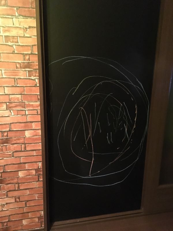 ダイソーでチョーク買ってきました 早速長男が豪快に描いて わざとかっ!とつっこみたくなるぐらい見事に 次々とチョークを折っていきました。。。 黒板シートですが、私が買ったやつは粘着力が弱いのか 壁紙の上から貼るのは想定していなかったのか 時間の経過とともに浮き上がってきており チョークで描くとぺりぺりと音がします 剥がれてくるのが怖いのではみ出して貼った部分もカットせずそのままにしています (長男がはみ出す勢いで描くのでカットせず正解でした) 落書き後ウェスで水拭きしてみましたが一度拭きだとちょっと後が残りました 長男が届かない上部に我が家のハウスルール(というか長男へのしつけルール) を書こうかなーと思っています 剥がれてくるかなー。。。